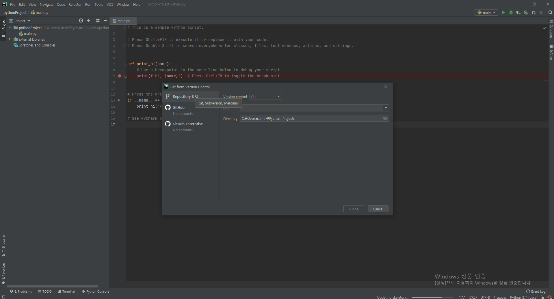 자주 사용하는 파이썬 IDE인 Pycharm을 바로 github와 연동해서 사용하고 싶었다.