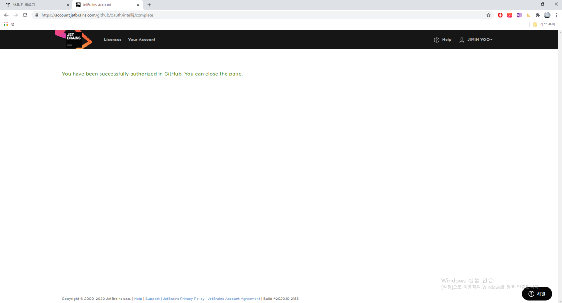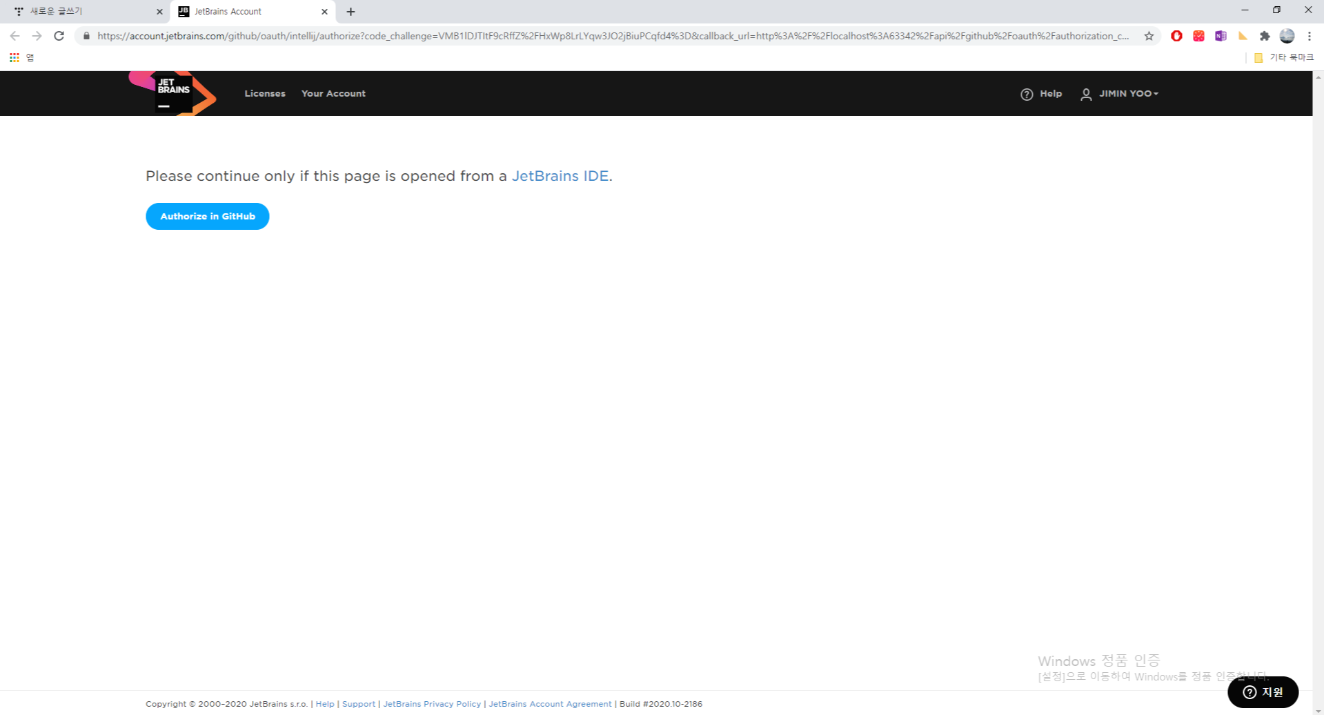 초록색 버튼인 'Authorize JetBrains'을 클릭.