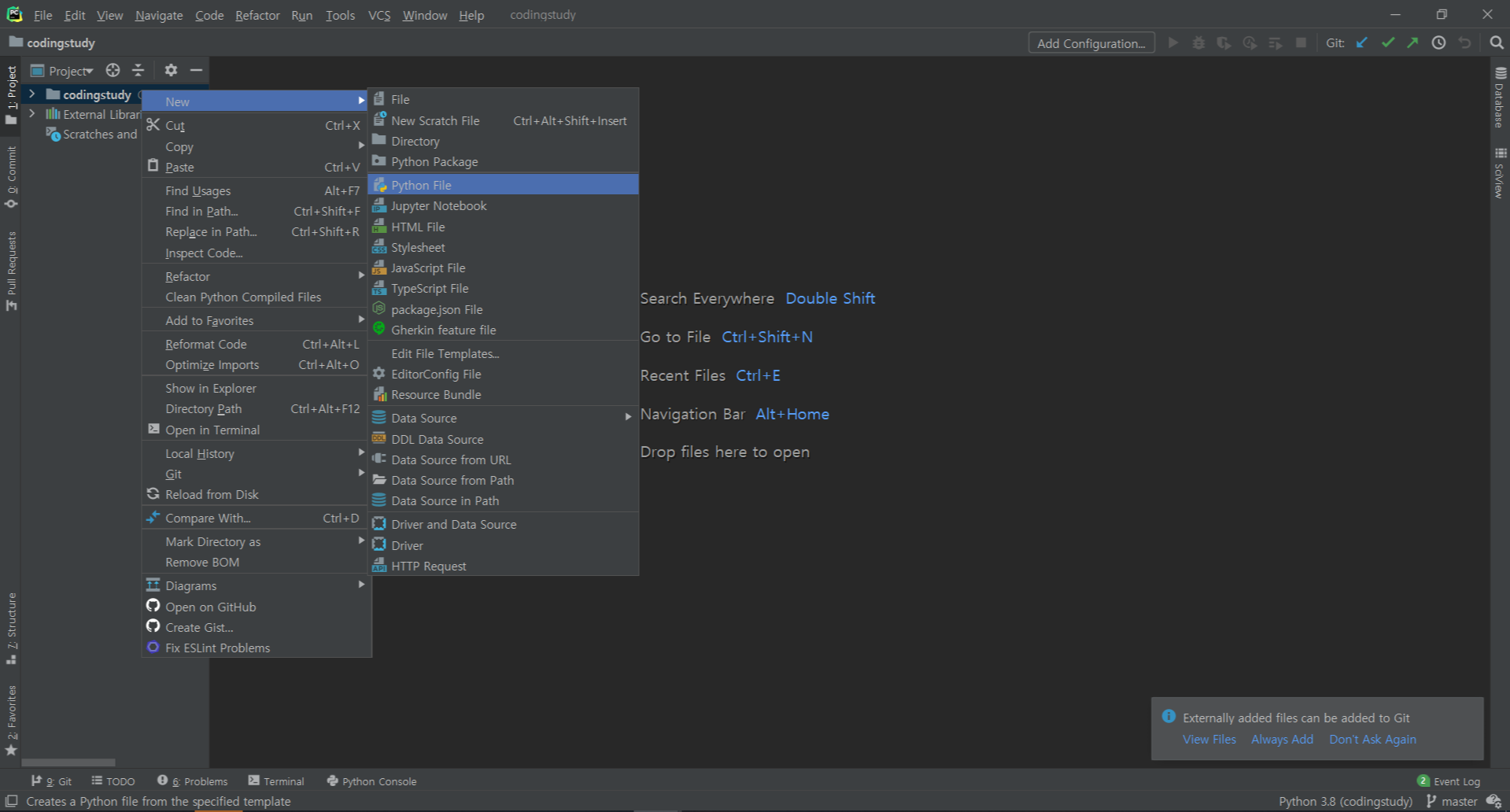 프로젝트 이름을 마우스 우클릭-[New]-[Python File]
