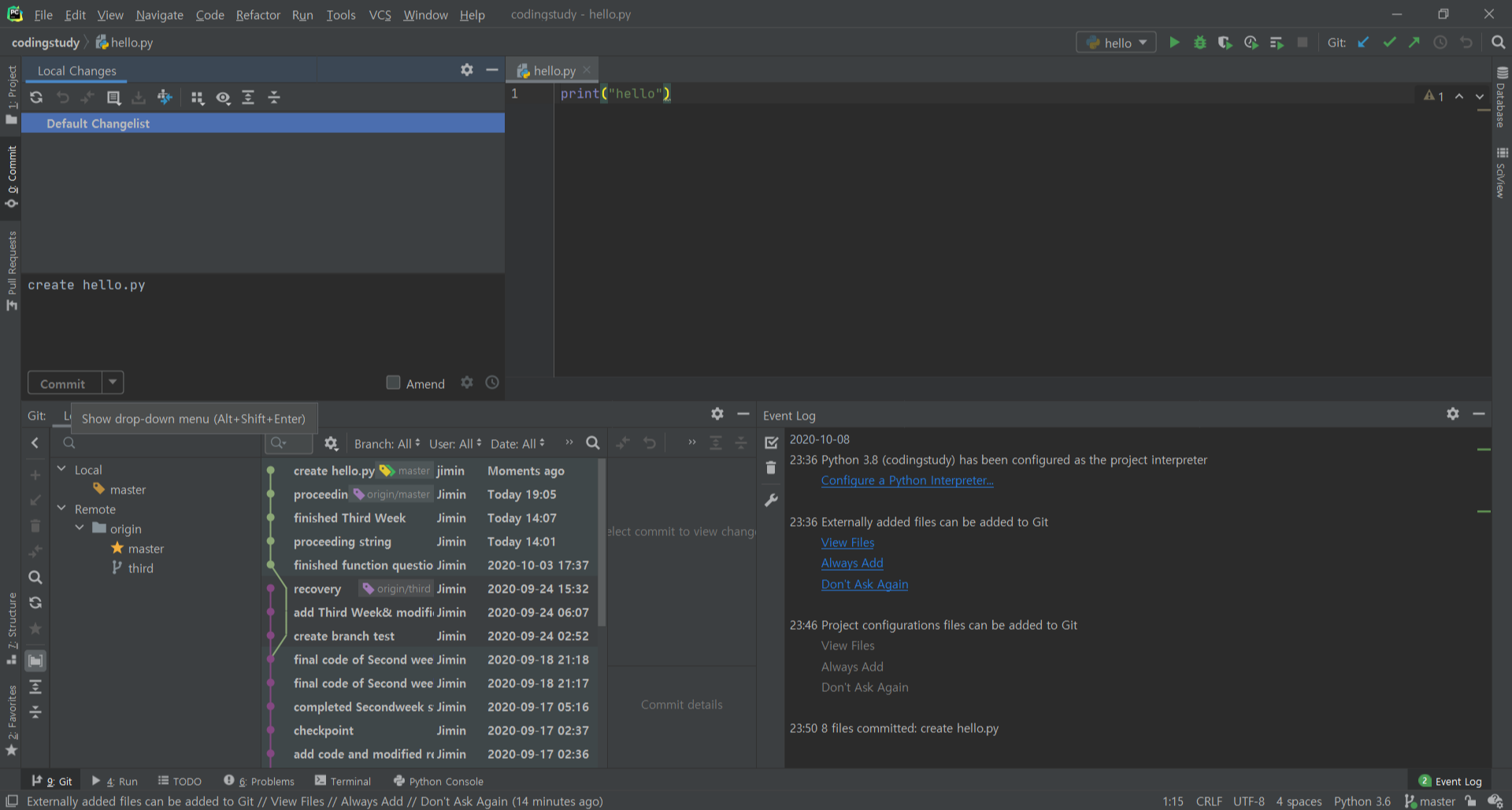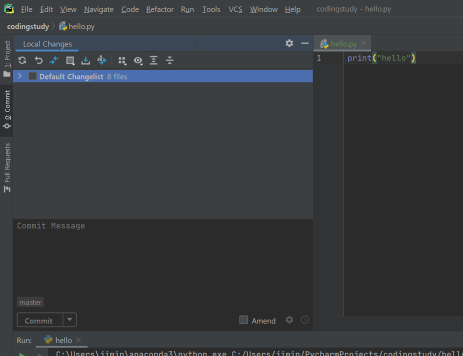Pycharm 하단에 Git을 클릭하면 git의 상태를 한 눈에 확인할 수 있다.