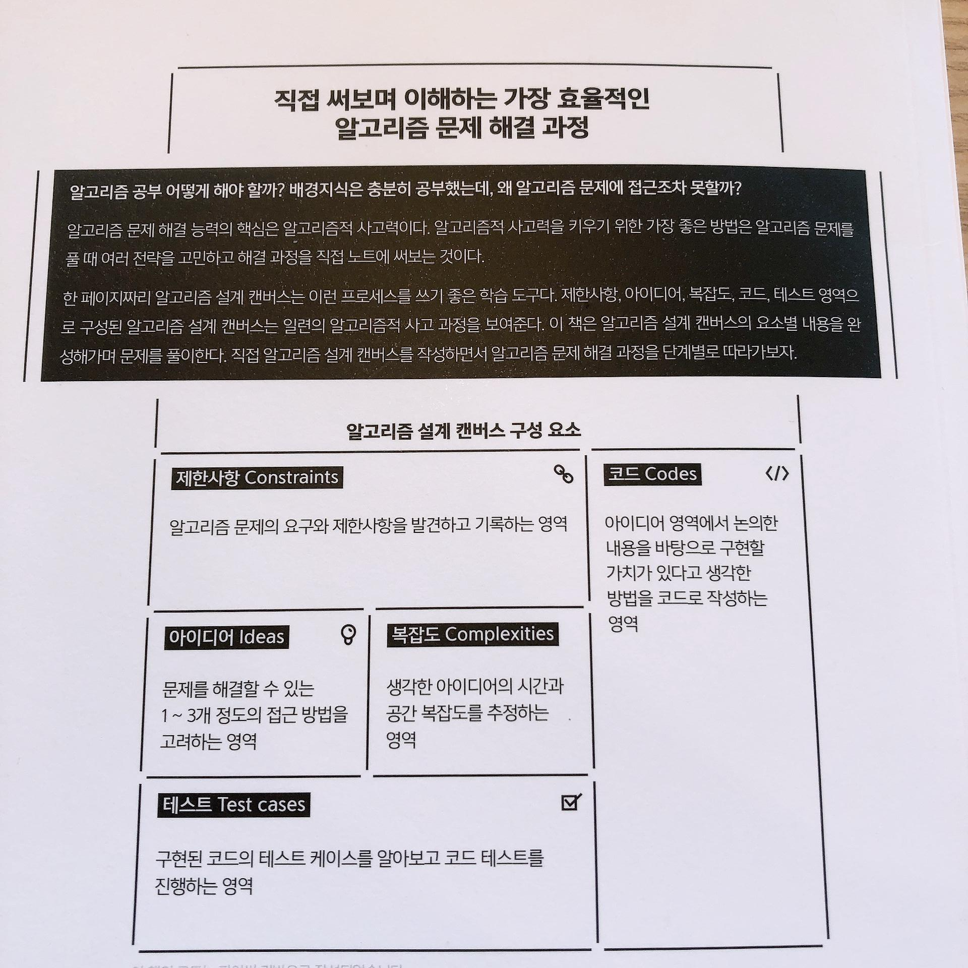 나는 자료구조와 알고리즘에 대한 강의도 수강해보고 책도 사서 읽어보고 했는데 이 책은 조금 색다른 방법으로 진행이 된다. 바로 노트 레이아웃을 이용한 문제풀이 접근 방법이다. 책 제목처럼 이 책은 직접 알고리즘 설계 캔버스(Algorithm Design Canvas)를 채워가면서 문제를 해결해나간다.