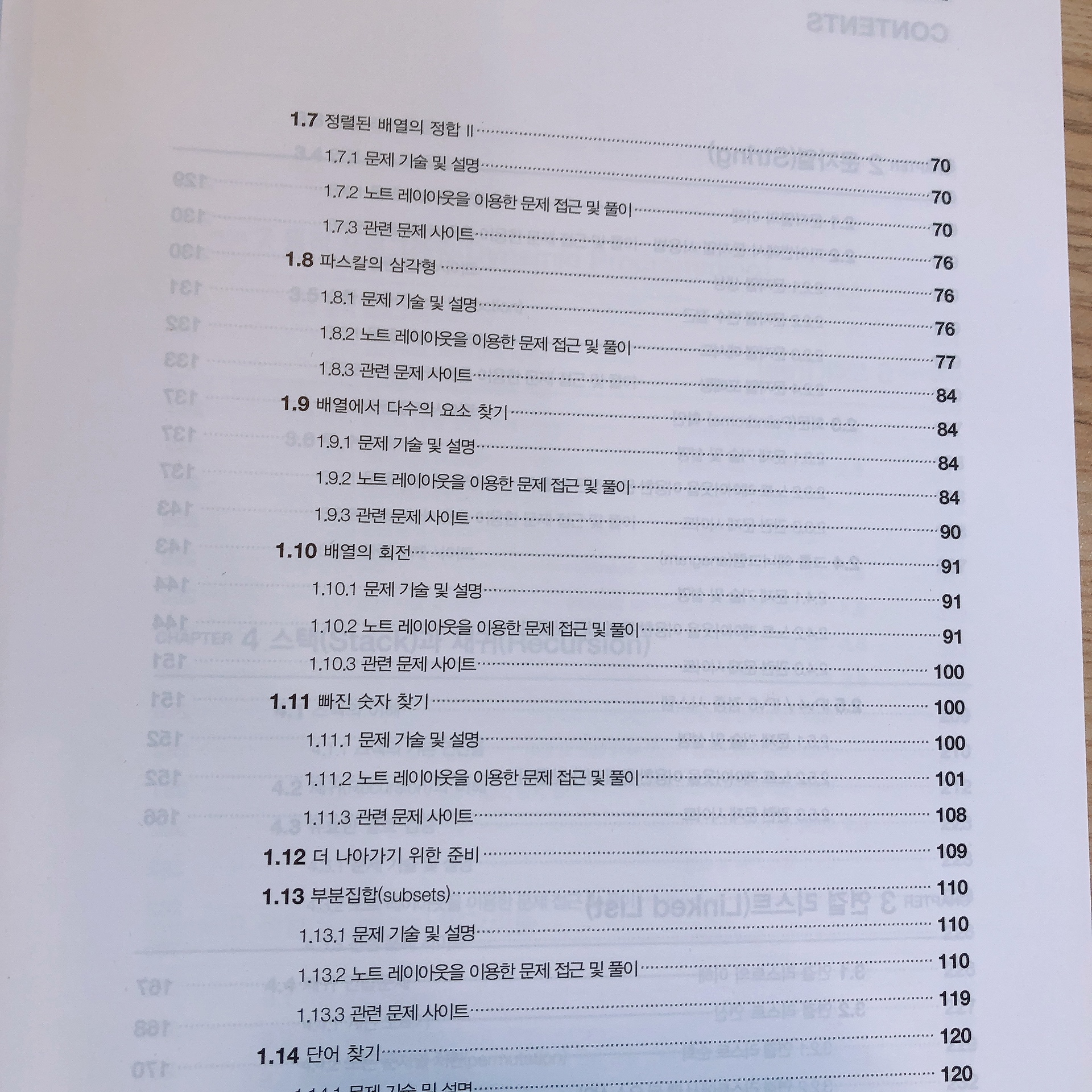 책의 순서는 배열 / 문자열 / 연결리스트 / 스택과 재귀 / 큐 / 트리 / 동적 프로그래밍 / 정렬 순으로 이루어져 있다.