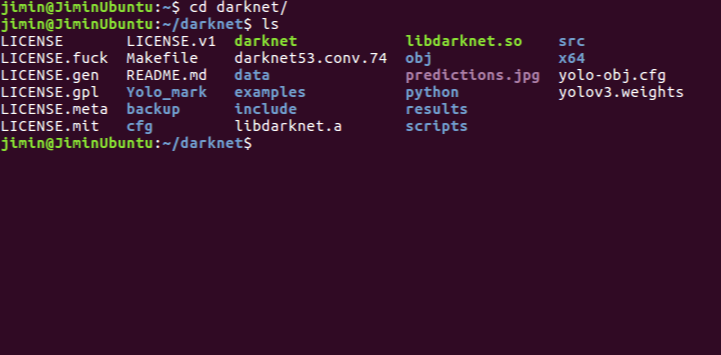 ~(홈)에서 darknet 디렉토리로 들어가면 우리가 학습 때 사용했던 yolo-obj.cfg 파일을 찾을 수 있다.