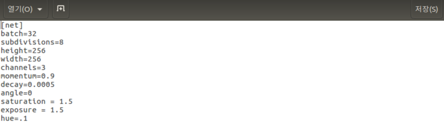 위에서 나는 batch의 개수를 64 ->32 로, height,width를 416 -> 256로 수정한 후 저장했다.