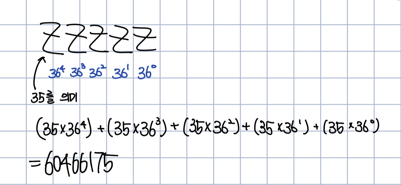 같은 방법으로 36진수인 ZZZZZ도 계산하면 답이 일치한다.
