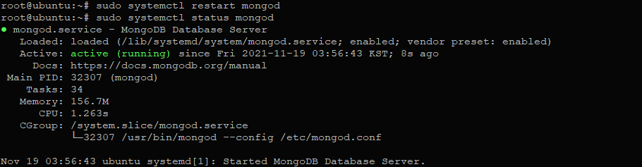 3) sudo systemctl(system) restart mongod (mongoDB를 재시작)
