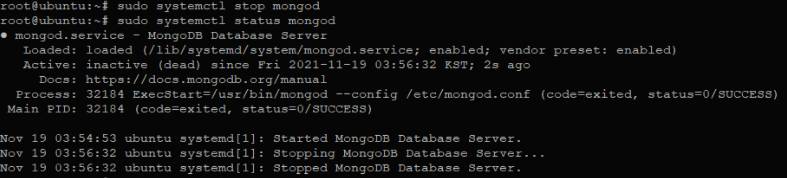 1) sudo systemctl(system) stop mongod (활성화 되어있는 mongoDB를 정지시킴)