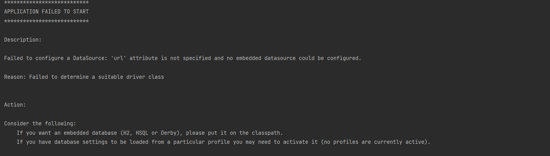 Failed to configure a DataSource: 'url' attribute is not specified and no embedded datasource could be configured.