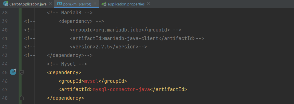 mysql.cj.jdbc.Driver가 빨간색인건 아직 dependency에 mysql을 추가하지 않았기 때문! 추가하면 자연스럽게 사라진다.