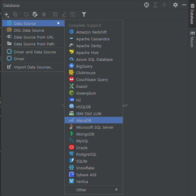 1)인텔리제이의 오른쪽 탭에서 Database -> +버튼 클릭 -> Data Source -> MariaDB 클릭