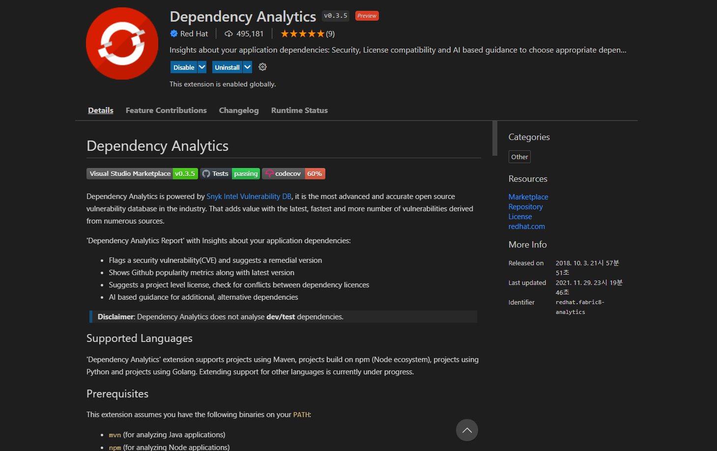 3) Dependency Analytics를 disable 하거나 uninstall