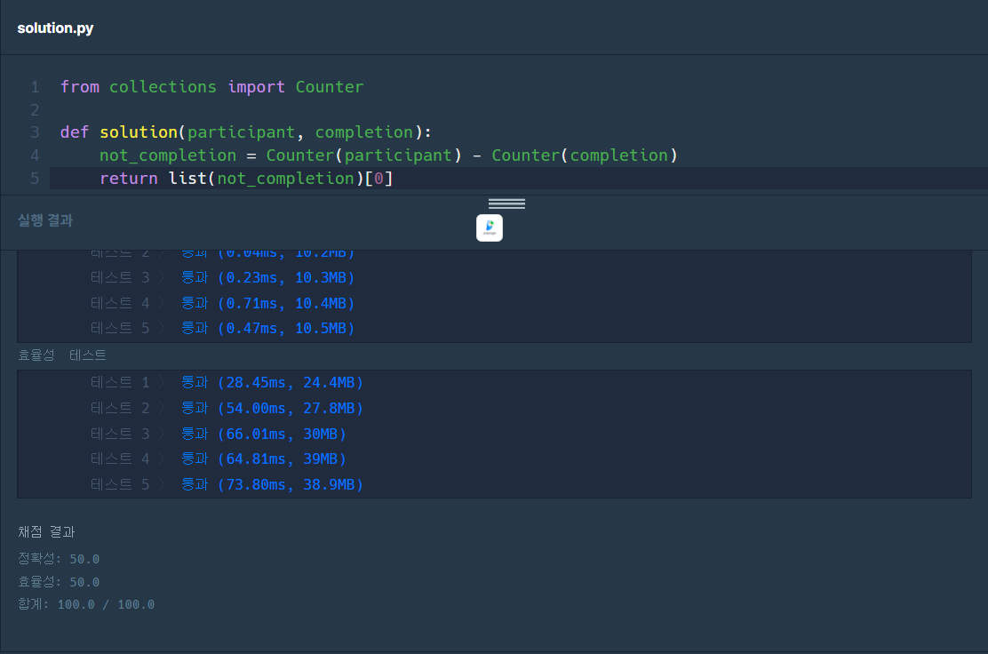 # participant와 completion을 각각 선언해주고 solution 함수에 인자로 넣어줌.