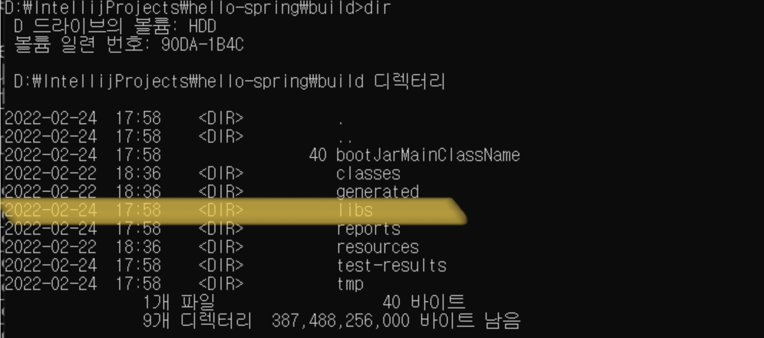 6. 5번까지의 과정이 끝나고나면 "build" 디렉터리에 "libs"라는 디렉터리가 새로 생긴다. -> cmd 창에서 "dir" 명령어로 확인 가능