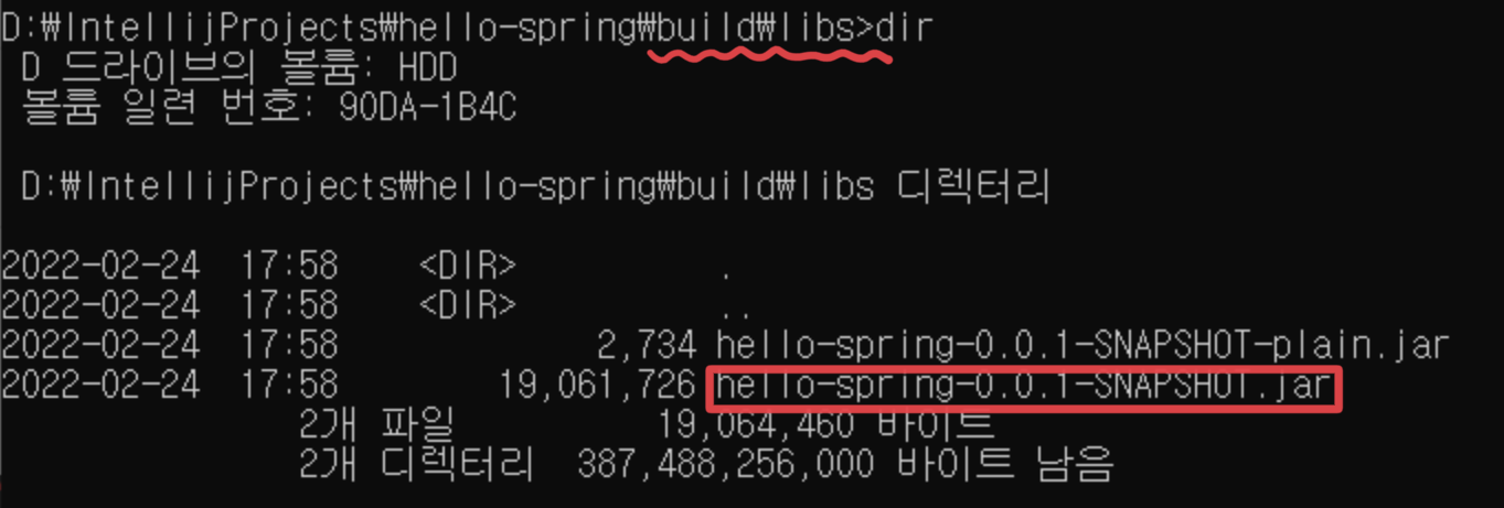 8. libs 디렉터리까지 위치를 이동한 다음 dir 명령어로 "프로젝트명-SNAPSHOT.jar" 파일이 존재하는지 찾기