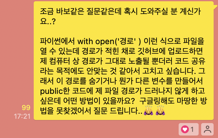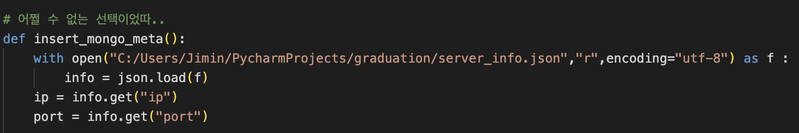ip나 port 번호같이 민감한 정보들을 노출시키고 싶지 않아서 처음엔 JSON의 형식으로 저장해서 필요할 때마다 꺼내썼다. 그마저도 저렇게 경로를 다써줘야 작동해서 내 컴퓨터 경로를 전세계 모든 사람에게 공개해버린 셈이다. 나중에 수정하자는 마음으로 냄겨뒀는데 드디어 고치기로 마음먹었다!