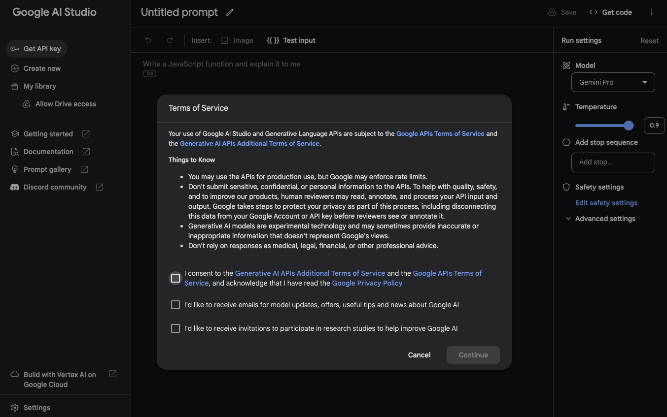 2. Get API Key in Google AI Studio 클릭 후 각종 약관에 동의하기
