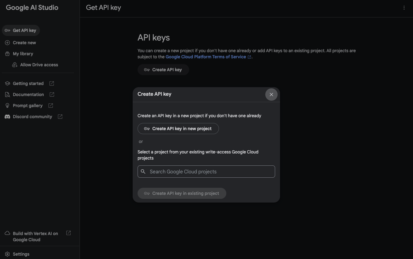 가운데 프롬프트 창에 뜬 Create API Key 클릭하고 새로운 프로젝트가 없다면 'Create API Key in new project' 아니면 구글 클라우드에서 프로젝트를 가지고 올 수도 있다.