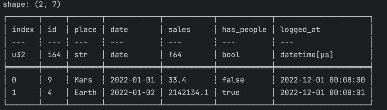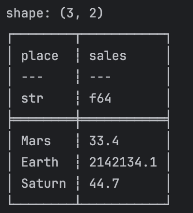 이건 내 개인적인 사용 후기이기도 한데, 기존 pandas 사용자들도 접근하기 쉽게 pandas 의 문법과 비슷하면서 조금 더 직관적인 문법이라고 느껴졌다. 아래 다루겠지만 데이터 프레임에서 특정 값을 가져올 때 select 로 가져올 수 있다는 것도 참신하고 직관적이어서 좋았다.