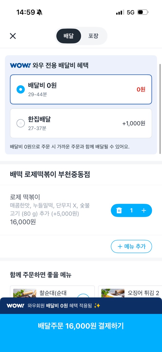 - 와우 회원의 경우 배달비가 0원이라는 점을 강조